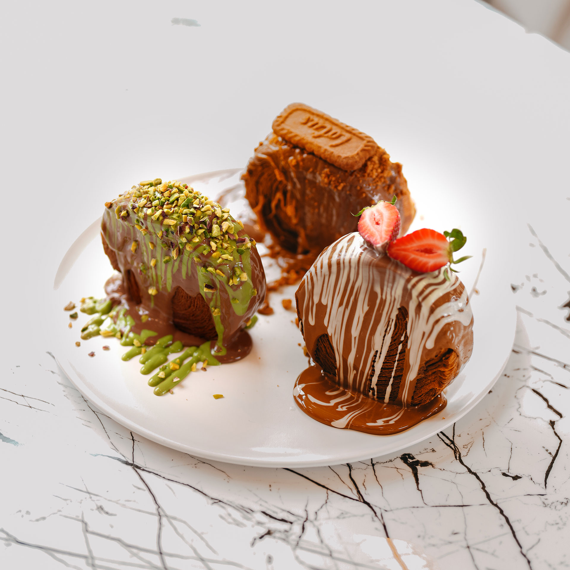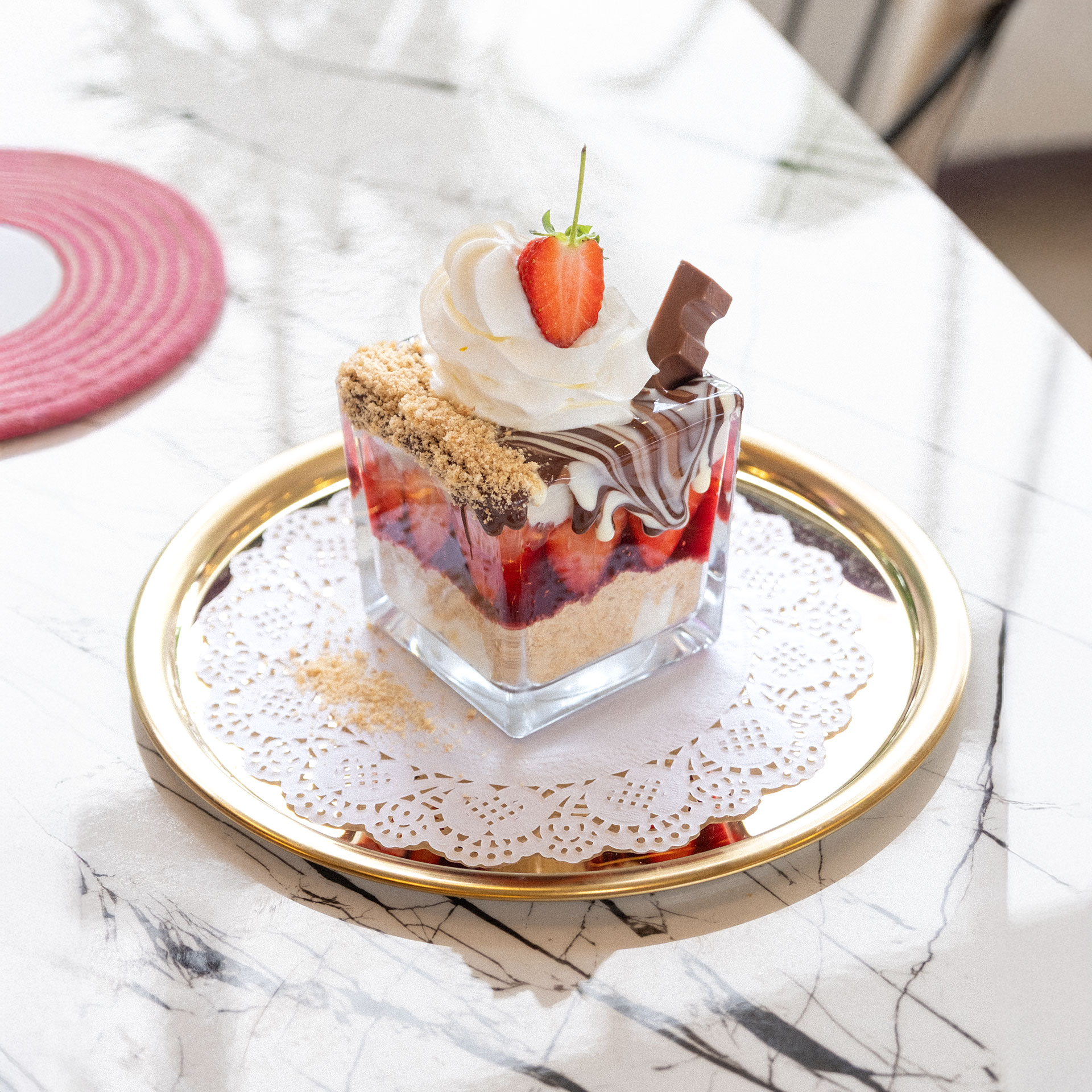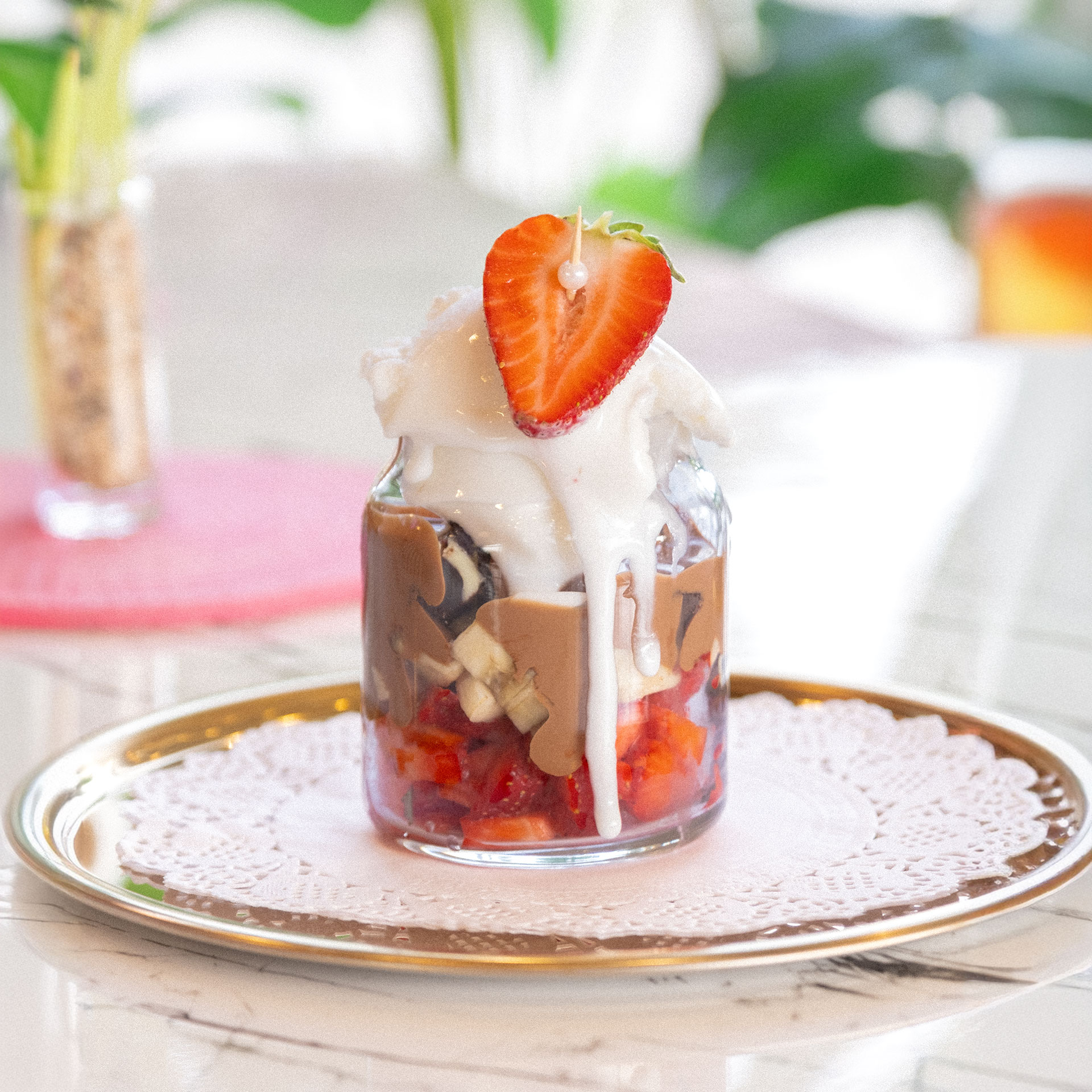 Muz , Çilek, Fransız bisküvisi, krema ve Belçika çikolatası ile sunum.